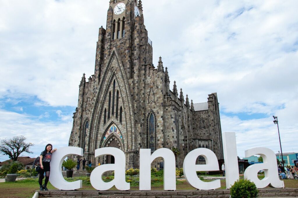 Depois, não pude deixar de registrar a clássica foto no famoso letreiro turístico de Canela, que fica próximo à catedral e é parada obrigatória para quem visita a cidade.